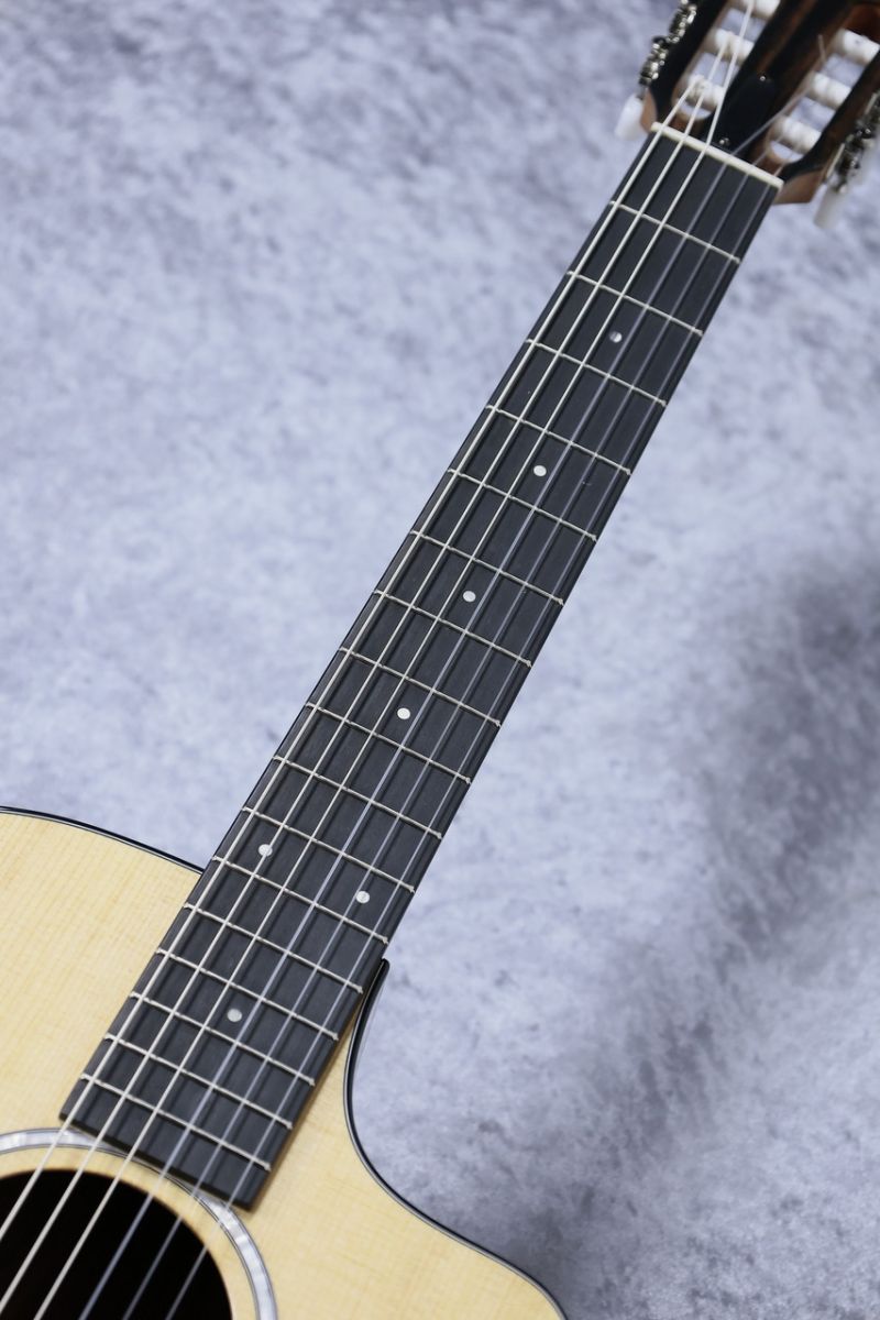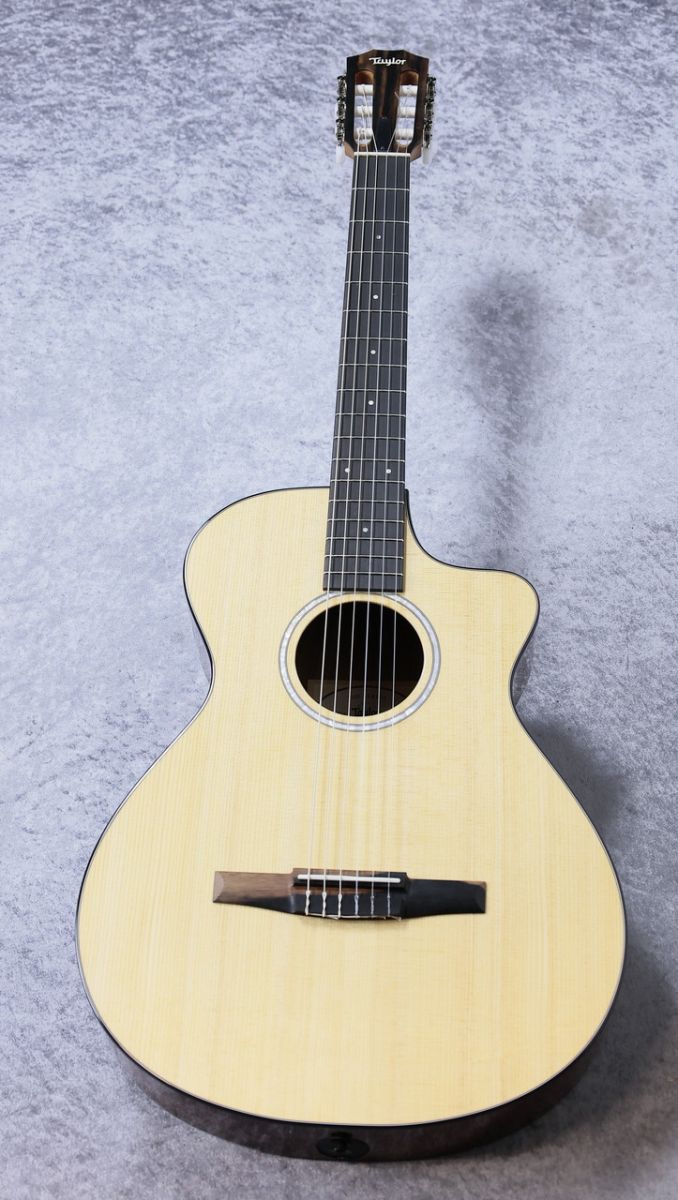 プレイアビリティの高さと、独自のピックアップシステムで評価の高い「Taylor」ナイロン弦仕様の抱えやすいサイズのグランドコンサートモデル!