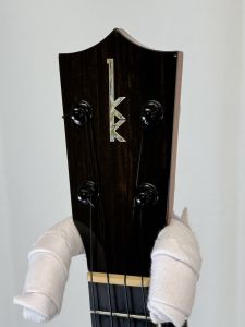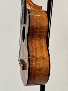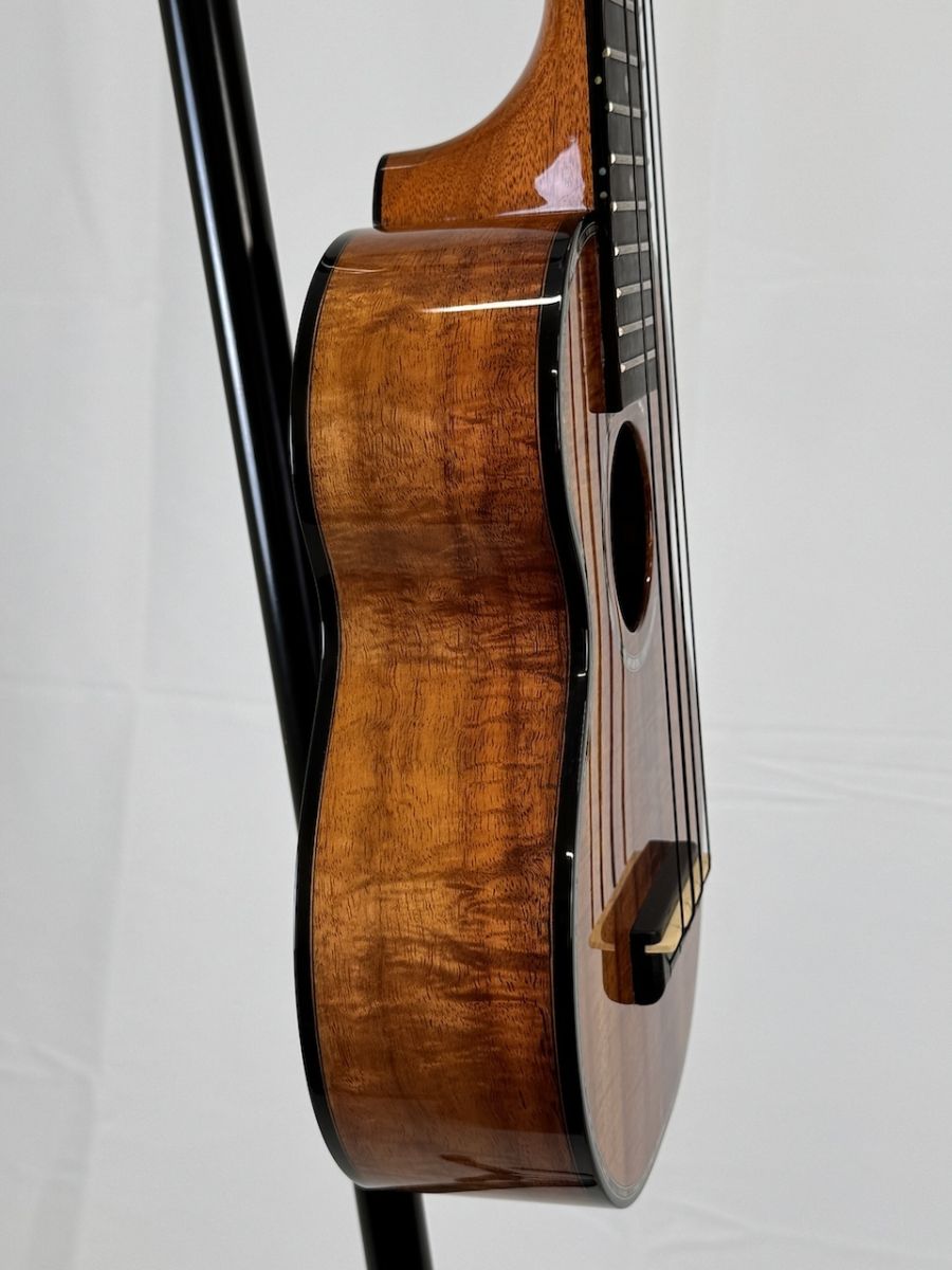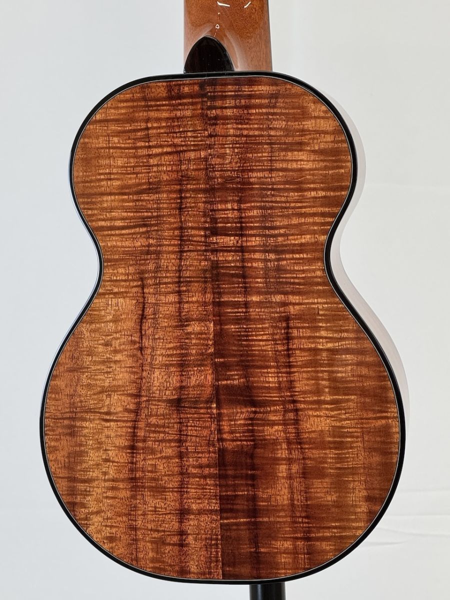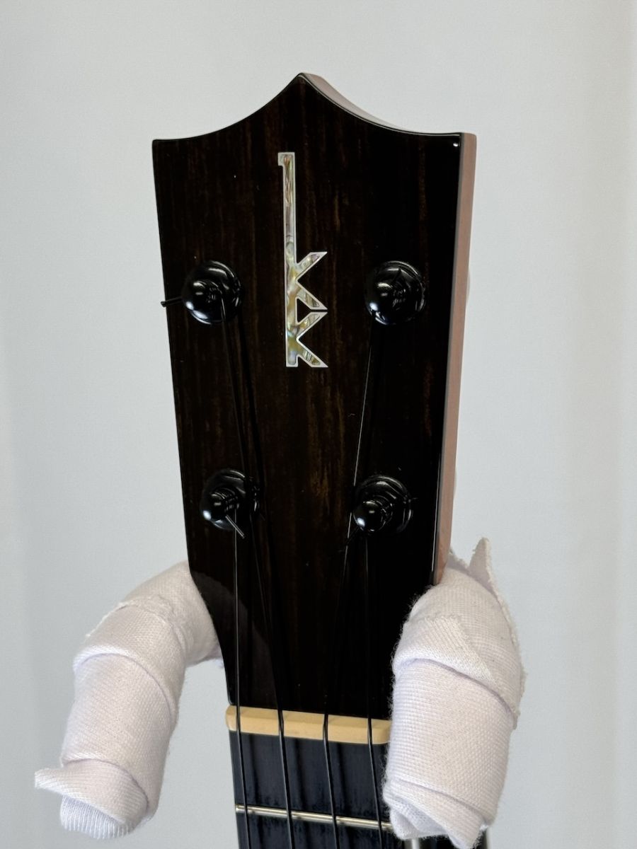 ボディ材には綺麗な木目の浮かぶカーリーハワイアンコアを贅沢に使用し、ブリッジ、指板にはこれもまた高級材であるエボニーを使用しております。