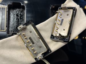 ピックアップカバー、ブリッジ、テールピースがグロス仕上げのものへ、ペグが半透明チップのシングルラインへ変更されています。
