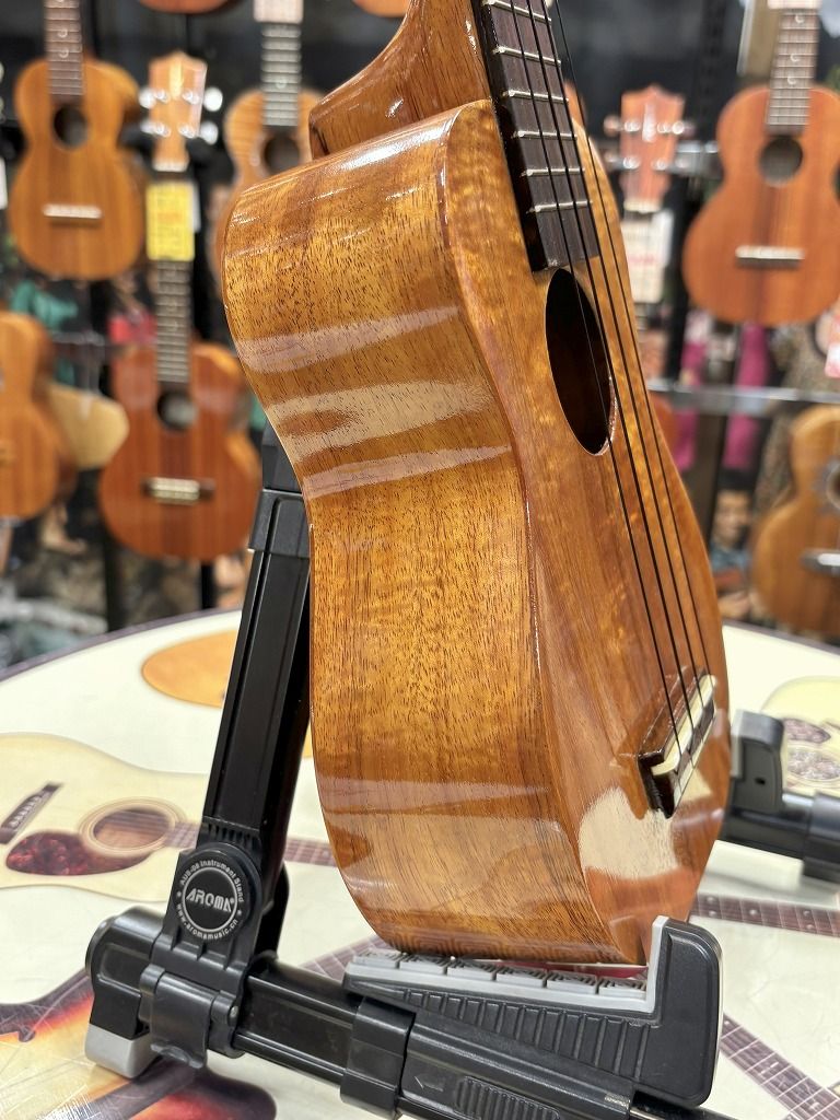 木材は良い木目のハワイアンコア単板ボディ、ヘッドトップにもカーリーコア、マホガニーネック、ローズウッド指板&ブリッジの組み合わせです。