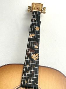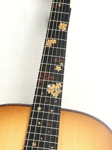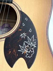 桜の花びらを模したピックガードには、秋へと移ろう色彩を表現するためにべっ甲素材を使用。
