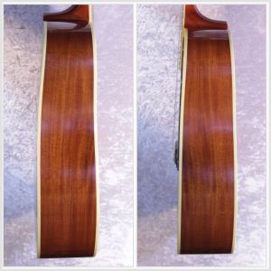 その他の主な仕様はサイド&バックにはマホガニーを使用、指板とブリッジはローズウッド材にマザーオブパールのパラレログラムインレイ、スケール(弦長)628.65mm、ナット幅43.8㎜、素材は牛骨。
