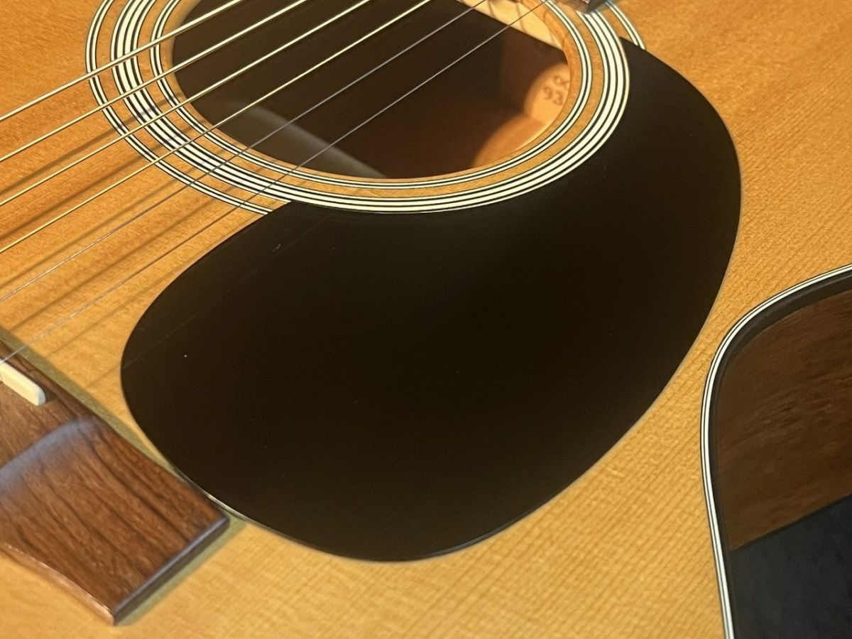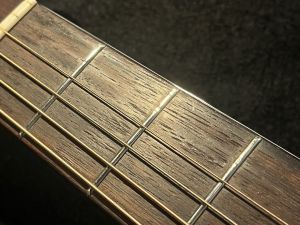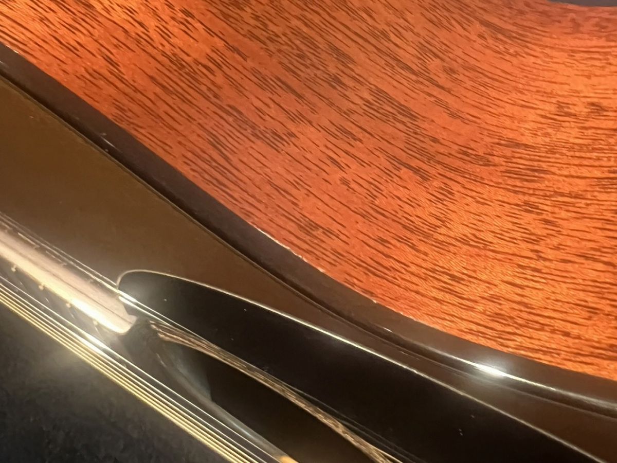 サウンドホール付近のピックスクラッチ等の小キズはあれど目立つキズや修理歴は無く、22年前に生産され使用されて来たギターである事を考慮すれば綺麗な個体と言えますが、1弦側のクビレ部(Top & Back)にバインディングに段差が生じており、1&2弦の1~3フレットに摩耗が見られ多少のビレが確認出来ます。