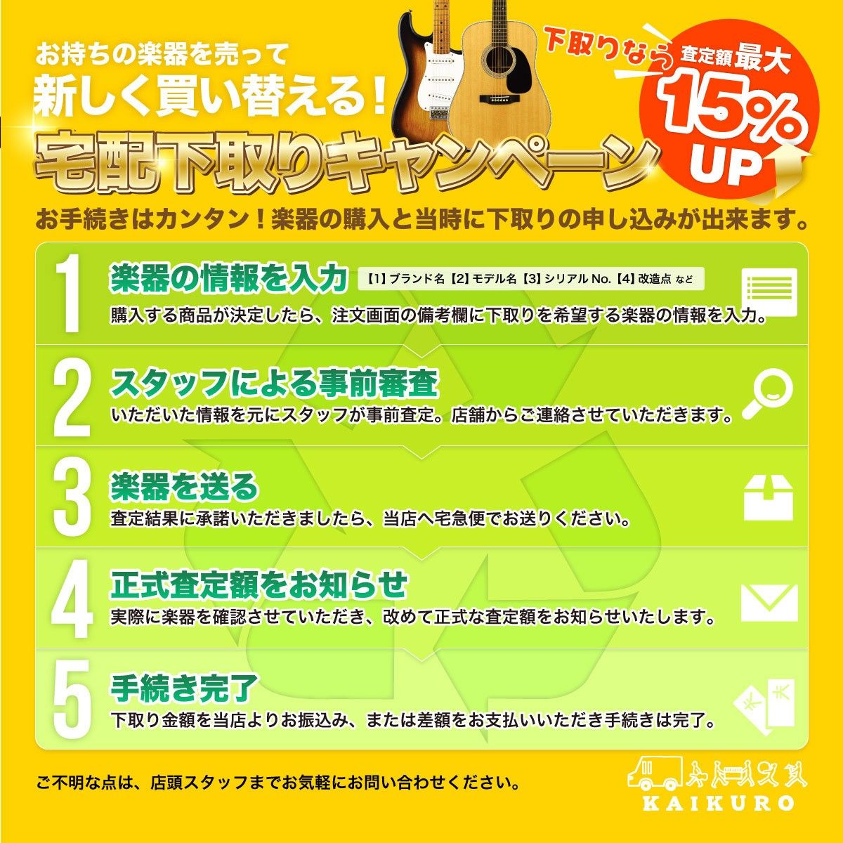 - 買取 下取り 委託販売 リペア カスタマイズ オーダーメイド 楽器レンタル リペアブース 近隣駐車場