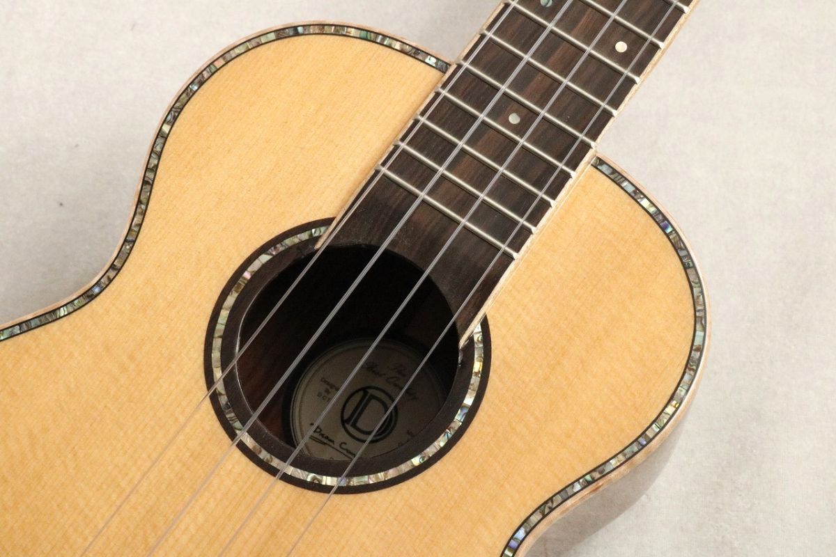 トップはスプルース単板、サイド・バックにはサントスローズウッドを贅沢にも単板で使用しており外観、サウンド共に非常に優れたモデル。この豪華な仕様で10万円以下という高いコストパフォーマンスを誇ります。コンサートサイズになり更にクラシックギター同様のスロッテッドヘッド形状により張りがあり残響感に優れた響きに加えスプルースxローズウッドのアコースティックギターでの王道の組み合わせで作られていますので煌びやかな高音、安定感のある低音が魅力的です。オール単板ボディなので弾き込むことでより深みのある響きに変化していく可能性を秘めた一本。DCTの特徴でもある豪華でありながら個性的なデザインとマッチした力強い杢目を持ったサントスローズウッド。眺めているだけでも楽しめる一本ですが奏でると更に愛着が生まれる素晴らしいモデルです!ぜひこの機会にお手に取って見てください!