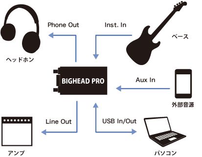 BIGHEAD PRO(ビッグヘッド・プロ)は、高性能ベース用モバイルヘッドホンアンプ。PC接続時は、入出力ともにハイレゾ規格に対応したオーディオインターフェースになります。