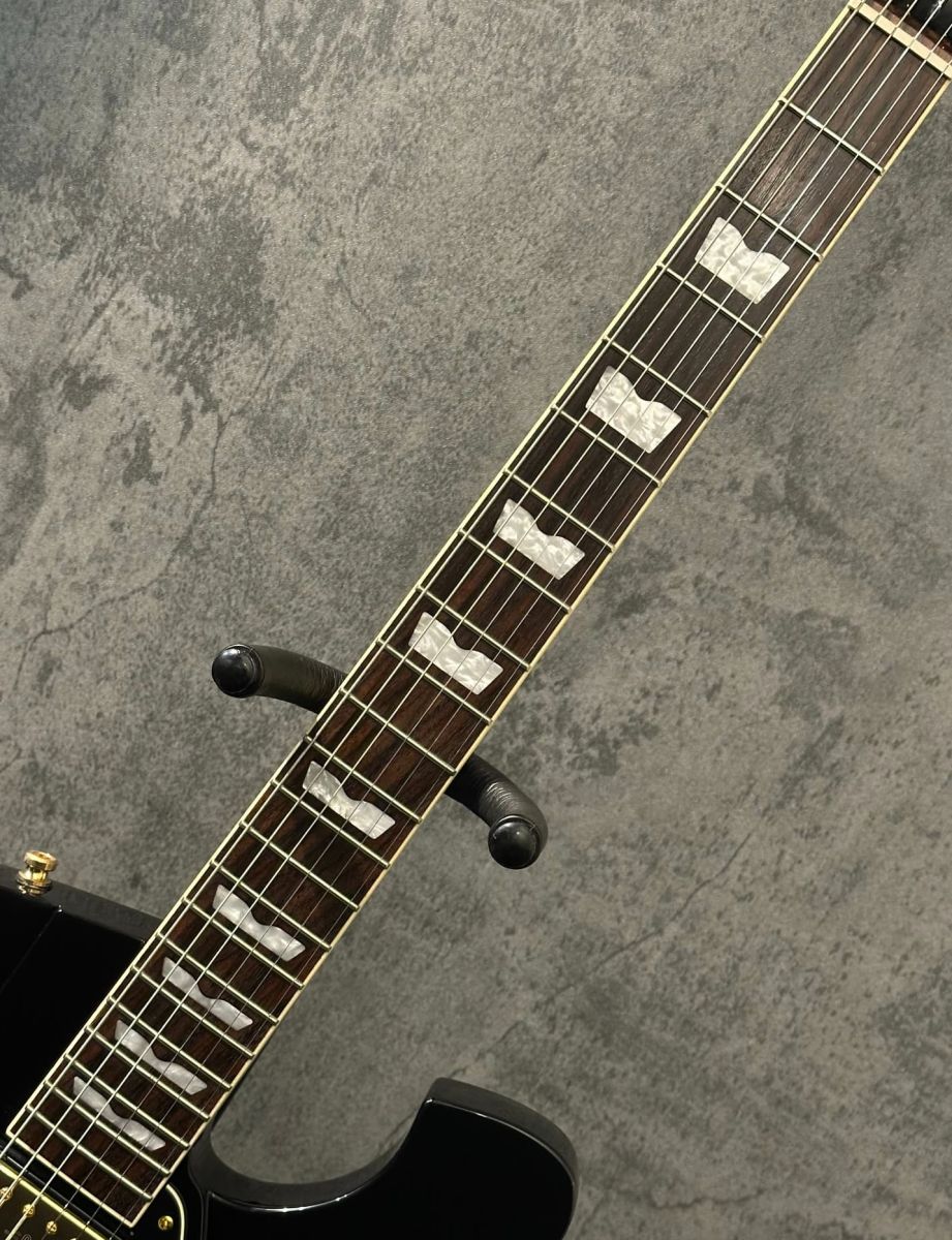 指板にはローズウッドを使用し、アイボリー・バインディングとパーロイドのクラウン・インレイが施されています。