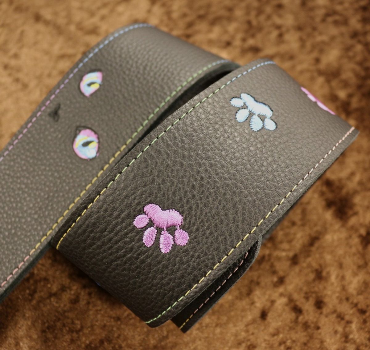 こちらは猫の目と鼻の刺繍があしらわれたとても可愛く素敵なストラップです!さらに足跡が一つ、二つ、三つ、四つ。。。。