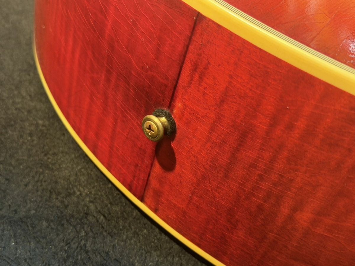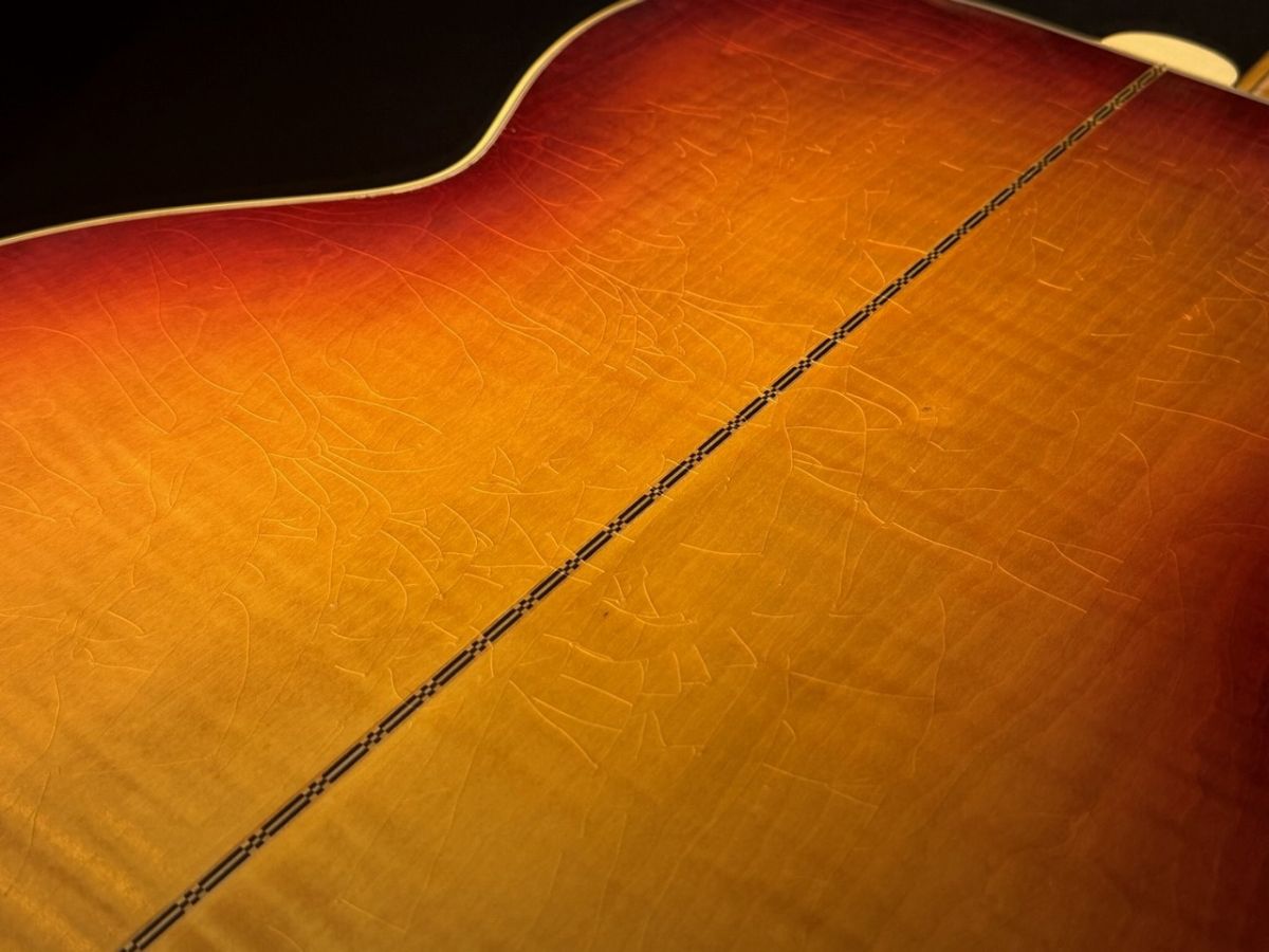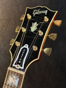 ボディ厚は現行品と比較してネックジョイント部で7㎜程厚く、バックセンターの寄せ木細工も再現。現行品ではサイドのエンドピン部にセルロイドがかまされていますが、当時同様のダイレクトジョイント。Tune O Maticサドルの駒もナイロン製(※ブラス製のTOMも付属)エイジングされたゴールドのKlusonワッフルバックチューナーもCoolです。