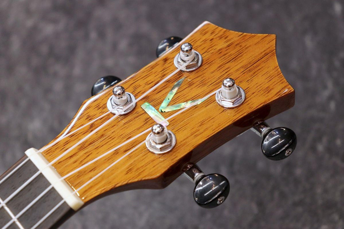 美しい光沢を持つ艶あり仕上げのモデルで、透き通ったサウンド。ハワイアン・コアの木目やアバロン貝のインレイがさらに輝き、ゴージャス感があります。