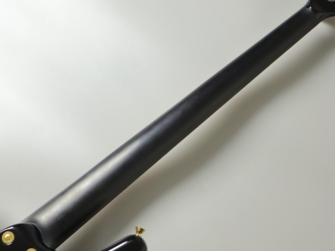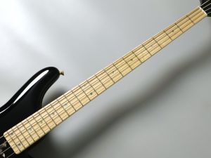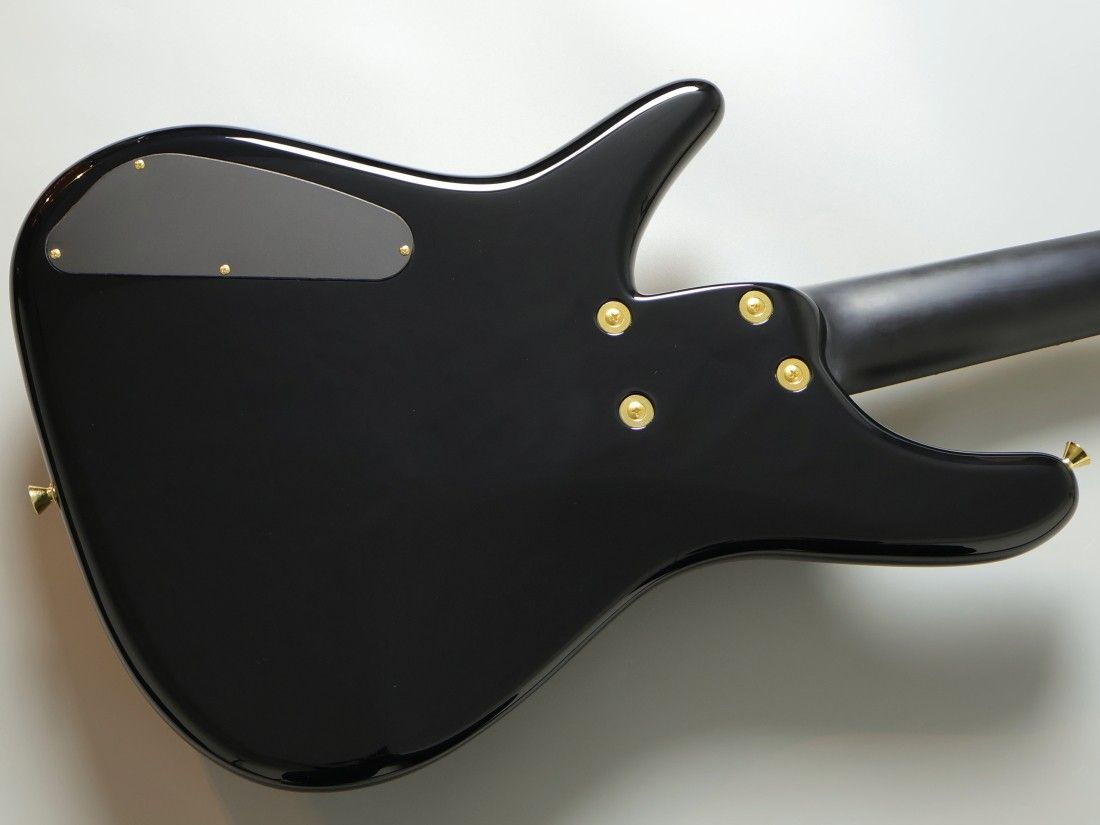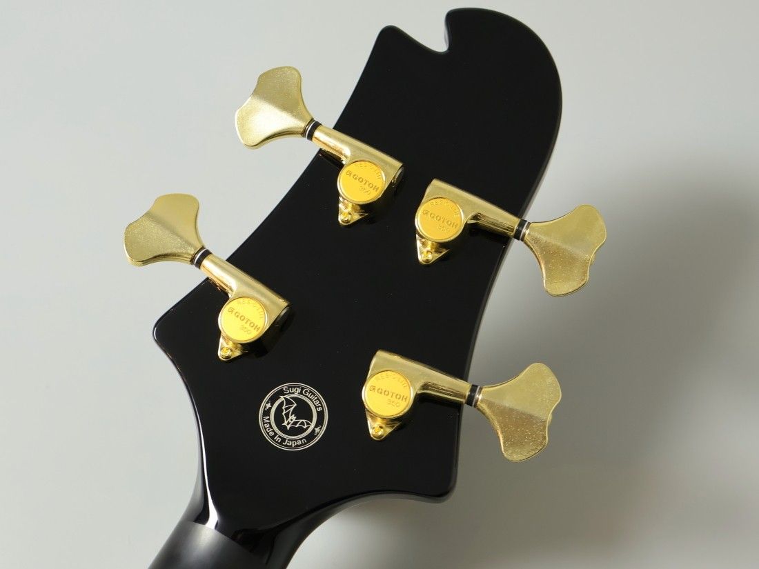 本機はアッシュボディ×メイプル指板の組み合わせ、そしてこの洗礼された塗りつぶしのブラックカラーのマッチングヘッド仕様はおそらくSugiのベースの中でも最もポピュラーなルックスの1つではないでしょうか。